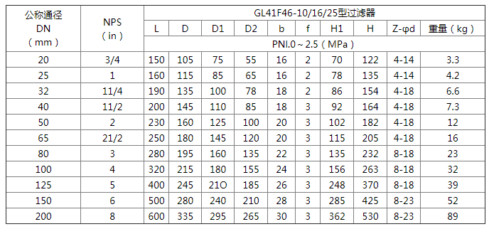 襯氟Y型過濾器主要連接尺寸及重量: