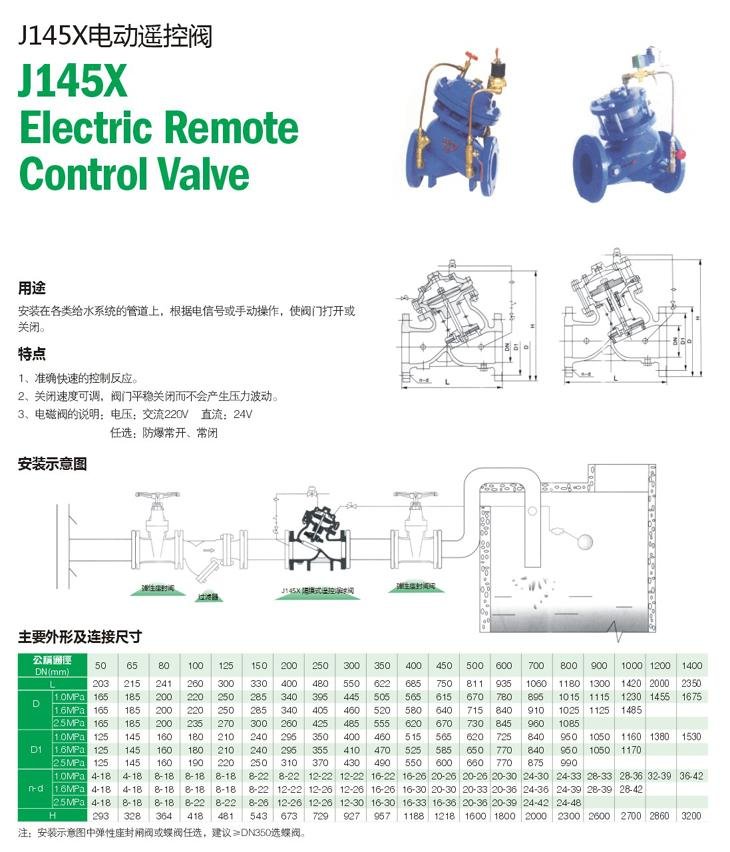 J145X隔膜式電動遙控閥是安裝在各類給水系統的管道上,根據電信號或手動操作,使閥門打開或關閉。準確快速的控制反應。關閉速度可調,閥門平穩關閉而不會產生壓力波動。采用三向電磁閥,維護簡單。